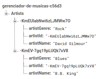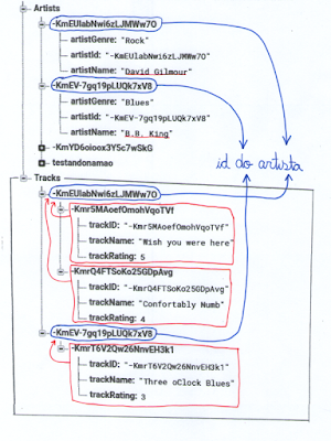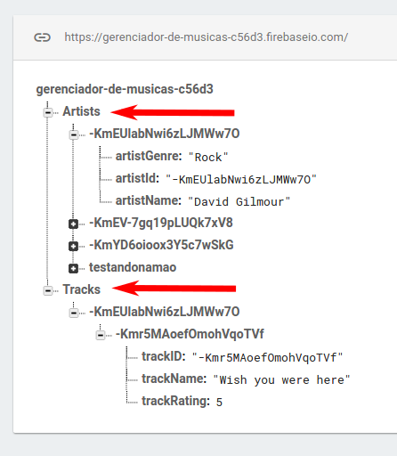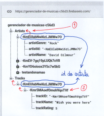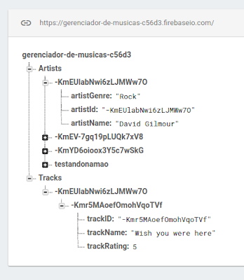 Lembrando o estado do nosso banco de dados: Debaixo da chave "Artists", temos o artista "David Gilmour", com id = KmEU... . As músicas dele estão debaixo da mesma chave, "KMEU...", que por sua vez está debaixo da chave "Tracks". Nossa referência para o Firebase, na activity relacionada com as trilhas, aponta então para "Tracks/KmEU...". Ou seja, toda gravação ou leitura de "tracks" acontecerá debaixo deste caminho.