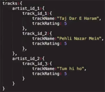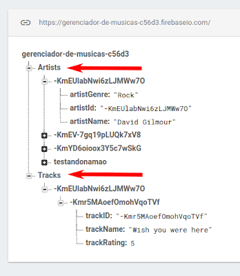 Porém, é importante ressaltar uma diferença importante entre as duas activities. Relembrando, temos no banco de dados duas "chaves" principais (quando eu falar em "chave", lembre-se que os dados estão sendo armazenados numa árvore JSON, conforme mostrado no primeiro post da série): a chave "Artists" e a chave "Tracks":